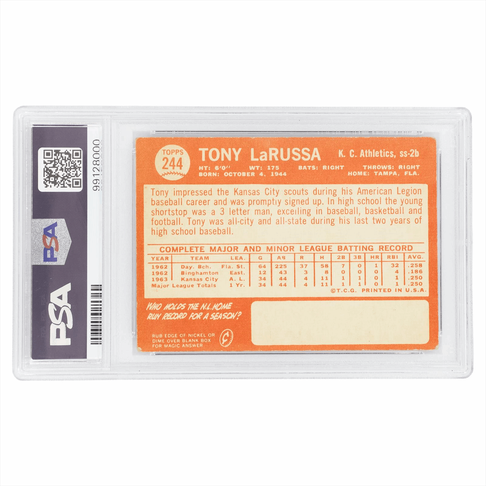 This is a PSA graded card. You will receive the card pictured. You are purchasing a 1964 Topps Tony Larussa #244 PSA VG 3 AUTO 10 card. This is an excellent card to add to your collection.