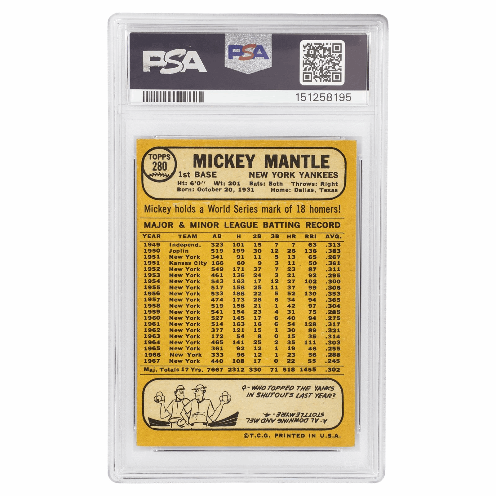 Product Details: This 1968 Topps Mickey Mantle #280 represents one of the final playing-era cards of the 'Commerce Comet,' captured in his iconic batting stance against the vibrant 'burlap' border design of the late sixties. Professionally graded PSA EX-MT 6, this particular example boasts excellent eye appeal with rich color saturation and a clean, glossy surface that highlights the legendary Yankee's portrait. The card features remarkably sharp corners for the grade and a well-preserved reverse that details the historic statistics of Mantle’s penultimate season in the Major Leagues. Secured under certification #151258195, this is a premier investment piece for collectors looking to own a high-grade staple from the twilight of the Mick’s storied career.
