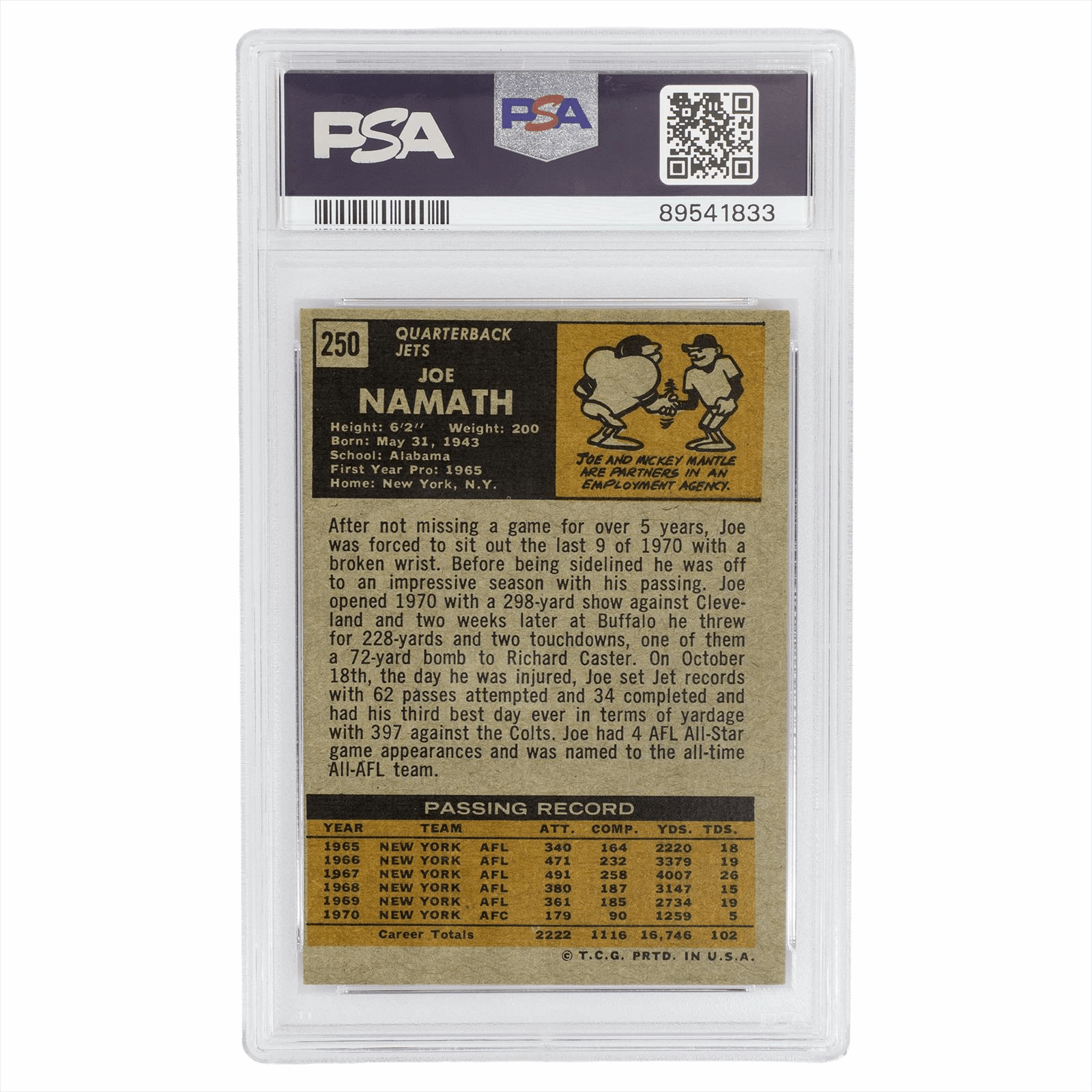 This is a PSA graded card. You will receive the card pictured. You are purchasing a 1971 Topps Joe Namath #250 PSA VG-EX 4 card. This is an excellent card to add to your collection.