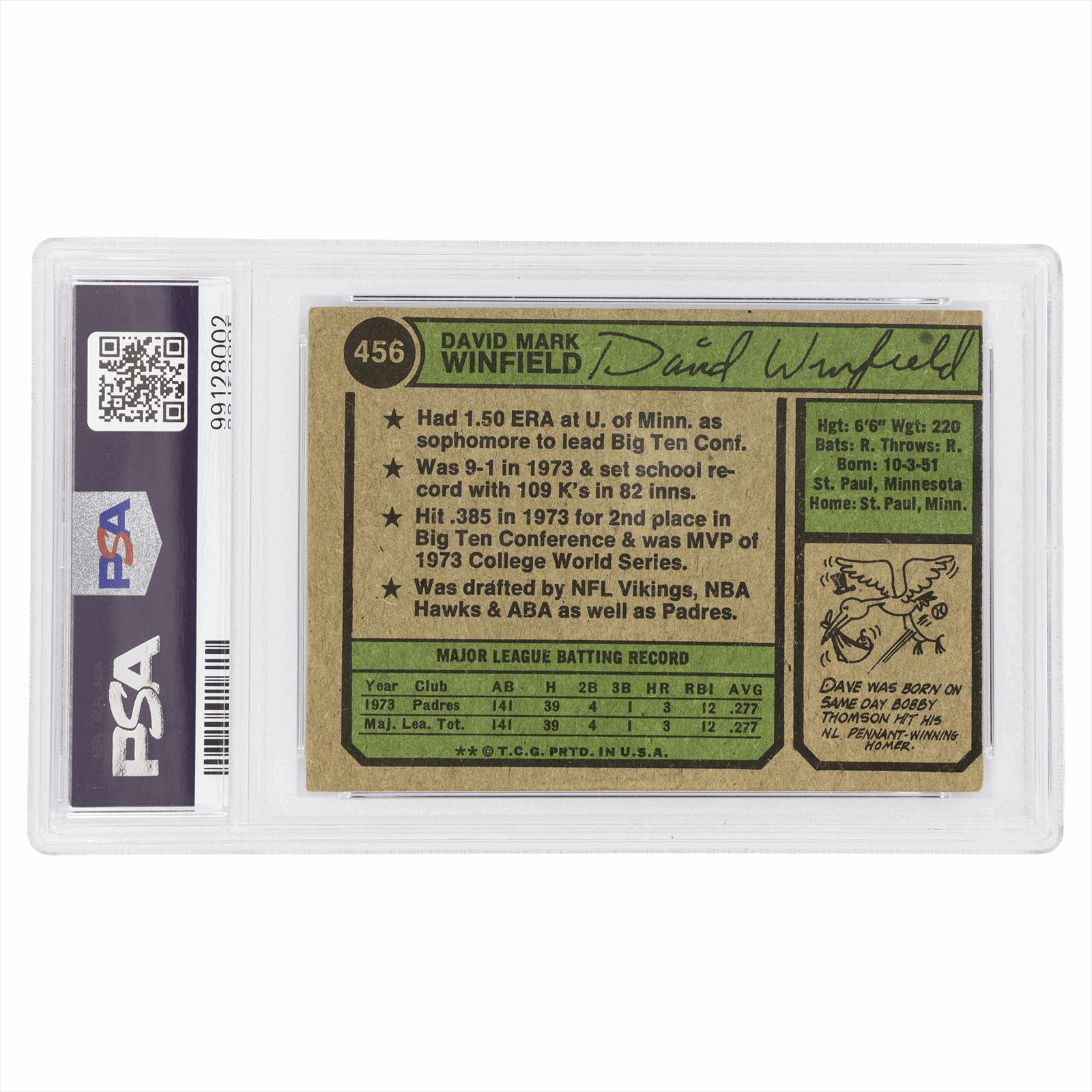 1974 Topps Dave Winfield #456 PSA GOOD 2 AUTO 10 Cert #99128002