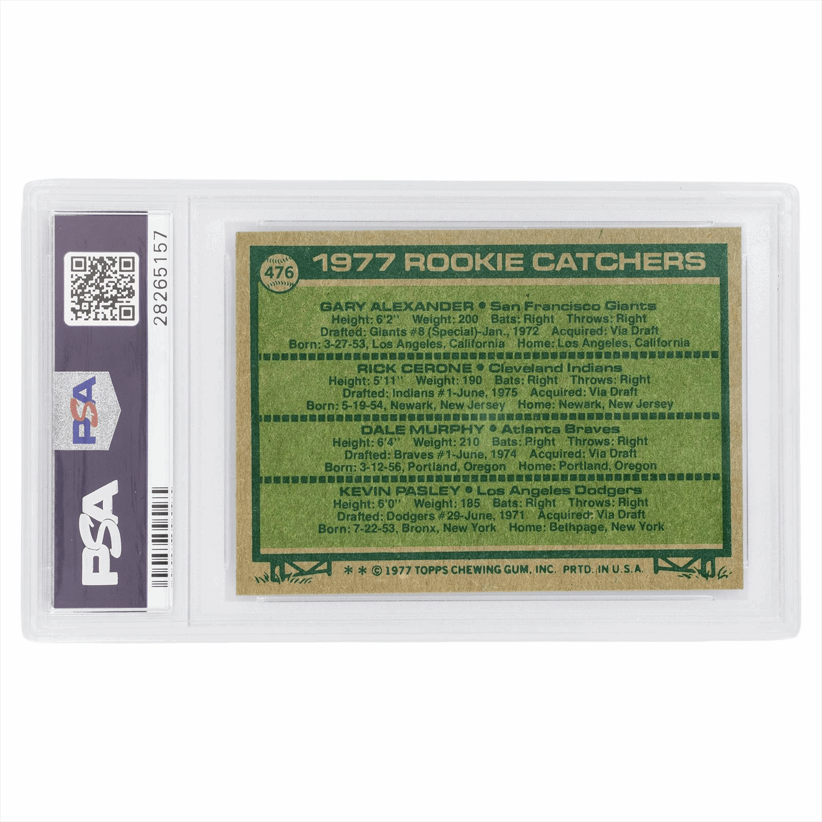 Product Details: Capture a foundational piece of baseball history with this stunning 1977 Topps Rookie Catchers #476, professionally graded by PSA as a MINT 9. This high-grade specimen features four promising prospects of the era, most notably the legendary Dale Murphy in his highly coveted rookie appearance. The card boasts exceptional eye appeal, characterized by razor-sharp corners, vibrant color saturation, and a pristine surface that remains free of common print defects. As one of the premier rookie cards of the 1970s, this PSA 9 example represents a top-tier investment for collectors seeking to add a 'pack-fresh' cornerstone to their vintage portfolio.