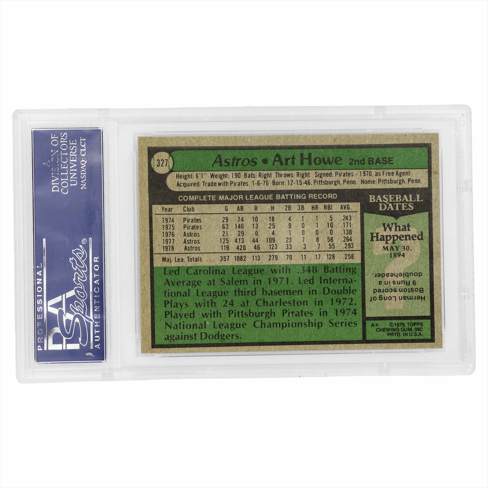 This is a PSA graded card. You will receive the card pictured. You are purchasing a 1979 Topps Art Howe #327 PSA GEM MINT 10 card. This is an excellent card to add to your collection.