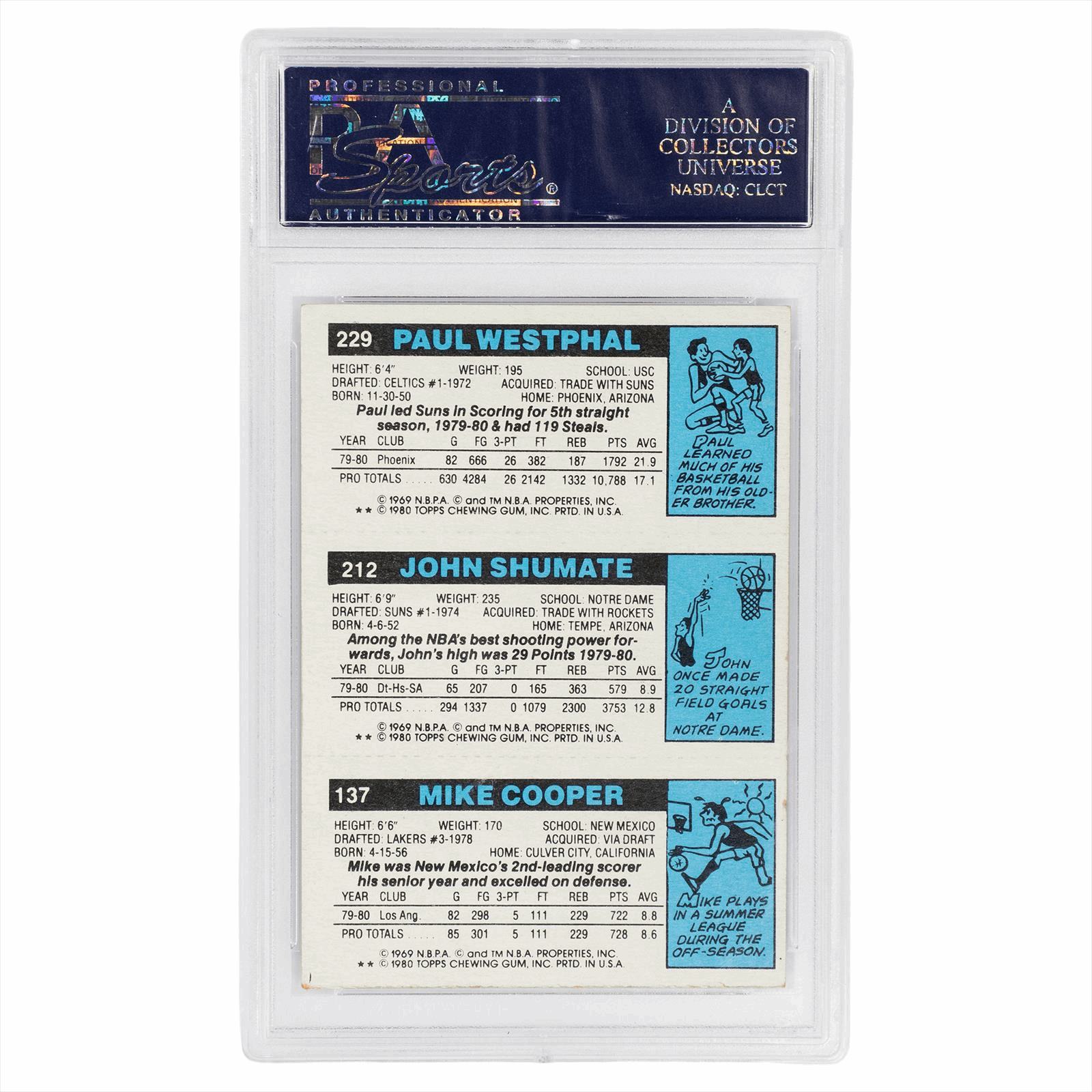 Product Details: This rare 1980 Topps basketball card features the Phoenix Suns trio of Mike Bratz (erroneously identified as 'Mike Cooper'), John Shumate, and Paul Westphal. This specific example has been hand-signed by Mike Bratz, the player pictured on the left who was misidentified by Topps, making it a unique 'corrected' collectible for error-card enthusiasts. The signature has been professionally authenticated and slabbed by PSA, ensuring the autograph's legitimacy and the card's long-term protection. Adding a signed version of this famous error card to your collection provides a fantastic conversation piece that bridges the gap between vintage basketball history and modern hobby authentication.