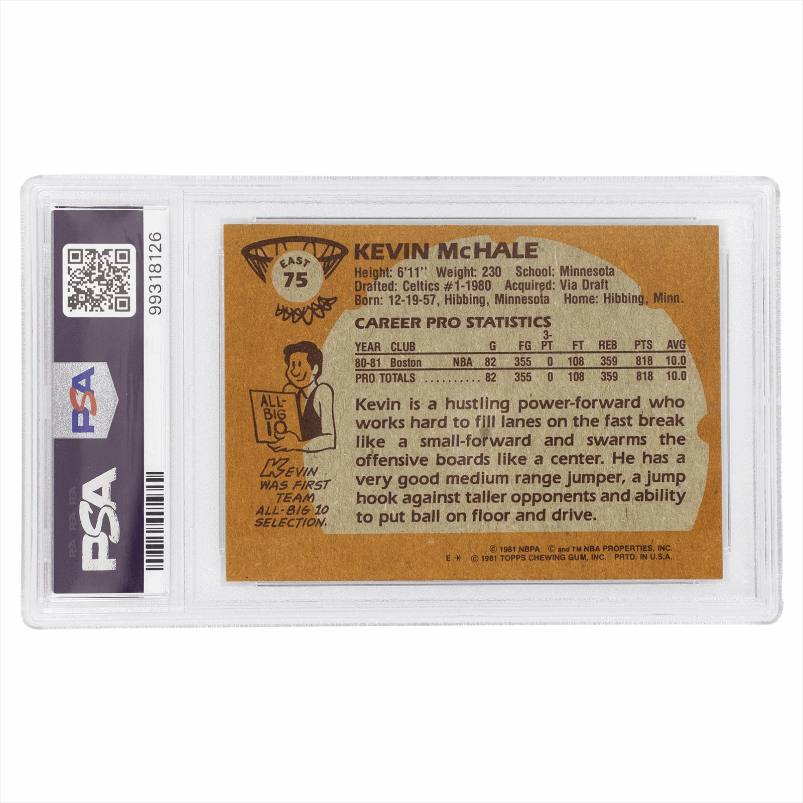 Product Details: This rare 1981 Topps Kevin McHale rookie card (#75 East) represents a cornerstone for any serious basketball collection, featuring one of the NBA's greatest power forwards in his debut year.This specific specimen has been professionally authenticated and graded by PSA as Near-Mint 7, ensuring the card’s physical integrity and vintage appeal are preserved. What sets this piece apart is the stunning on-card autograph, which has earned a perfect AUTO 10 grade for its exceptional clarity and boldness. Fully verifiable via PSA certification #99318126, this dual-graded rookie card offers the perfect blend of historical significance and investment-grade quality. Card Features: