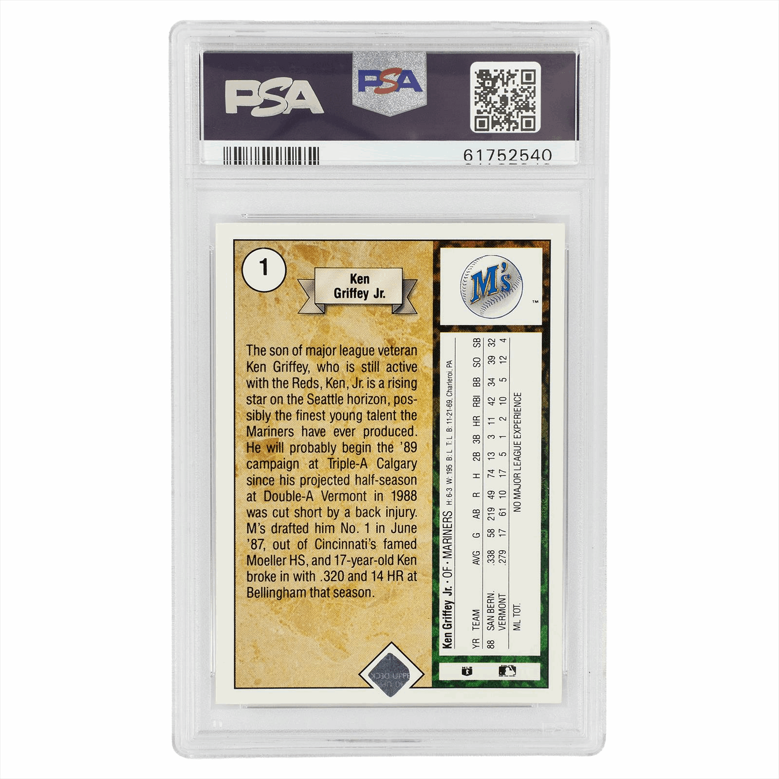 This is a PSA graded card. You will receive the card pictured. You are purchasing a 1989 Upper Deck Ken Griffey Jr Rookie #1 PSA NM 7 card. This is an excellent card to add to your collection.