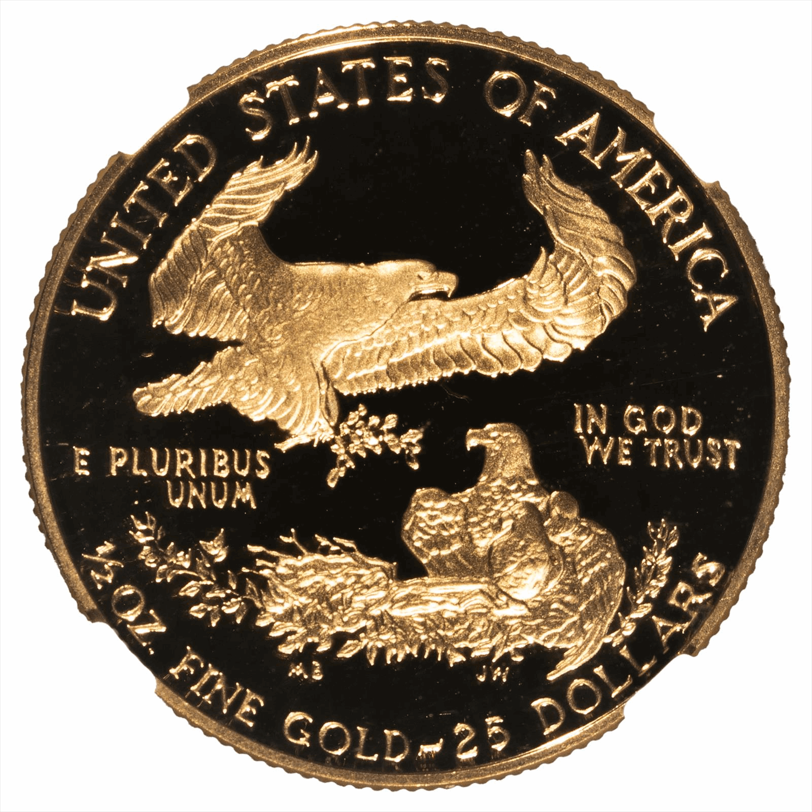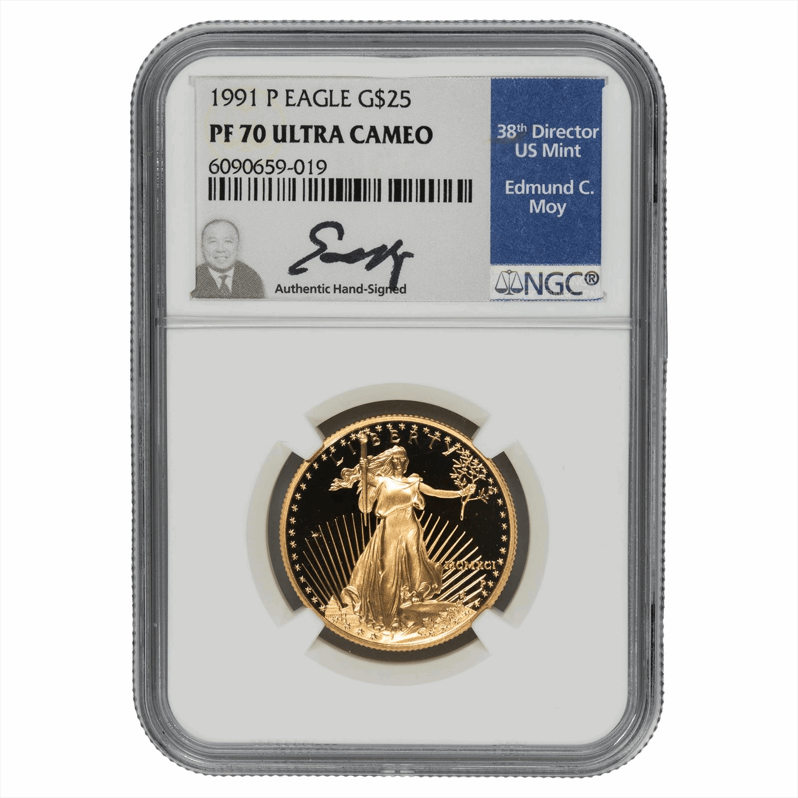 Product Details: 1991 P Eagle Gold Coin, graded PF 70 Ultra Cameo by NGC, exemplifies the pinnacle of collectible numismatics. This stunning gold piece has a face value of $25 and a gold content of 1/2 oz, showcasing both intricate artistry and intrinsic value. The obverse features the iconic Liberty design, realized with extraordinary detail, symbolizing freedom and strength. It is beautifully struck in 22-karat gold, enhancing its rich luster and brilliant finish. Along with the classic depiction of Liberty, the coin showcases sun rays radiating from behind, accentuating its artistic merit. The reverse presents a striking image of a bald eagle, a cherished symbol of America, in a nested position with its young. The details are crisp, and the design reflects the utmost craftsmanship inherent in American coinage. Encased in an NGC holder, this collectible is not just a coin; it is a testament to U.S. Mint history. Each piece bears the authentic hand signature of Edmund C. Moy, the 38th Director of the U.S. Mint, providing an added layer of significance for collectors and investors alike. With a certification number of 6090659-019, this coin is verified for its authenticity and grading, making it a must-have for serious collectors. Secure your piece of American heritage today.