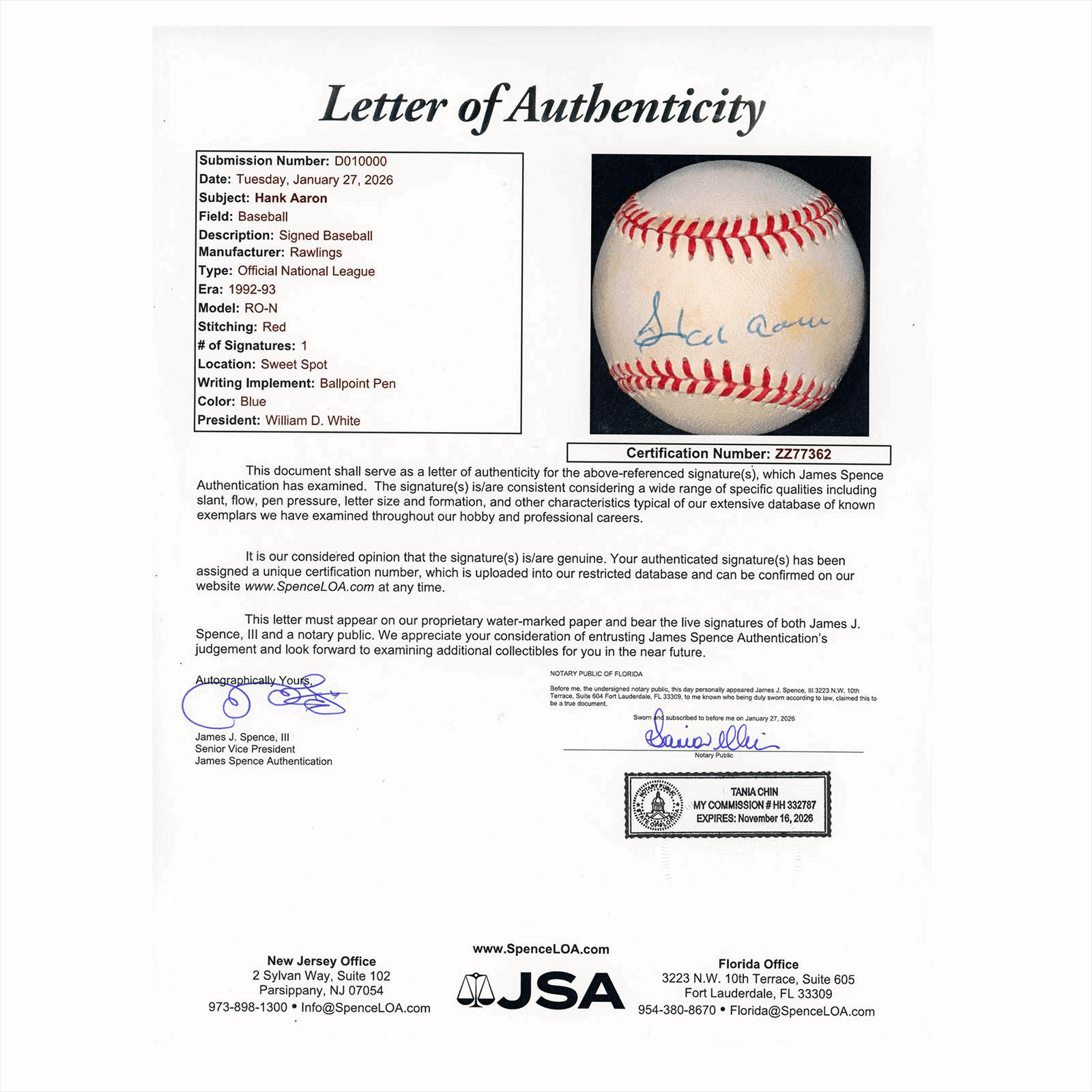 This is a JSA Authenticated signed baseball. You will receive the ball pictured. You are purchasing a 1992-93 Hank Aaron Signed Baseball JSA Authenticated w/ LoA. This is an excellent piece to add to your collection.