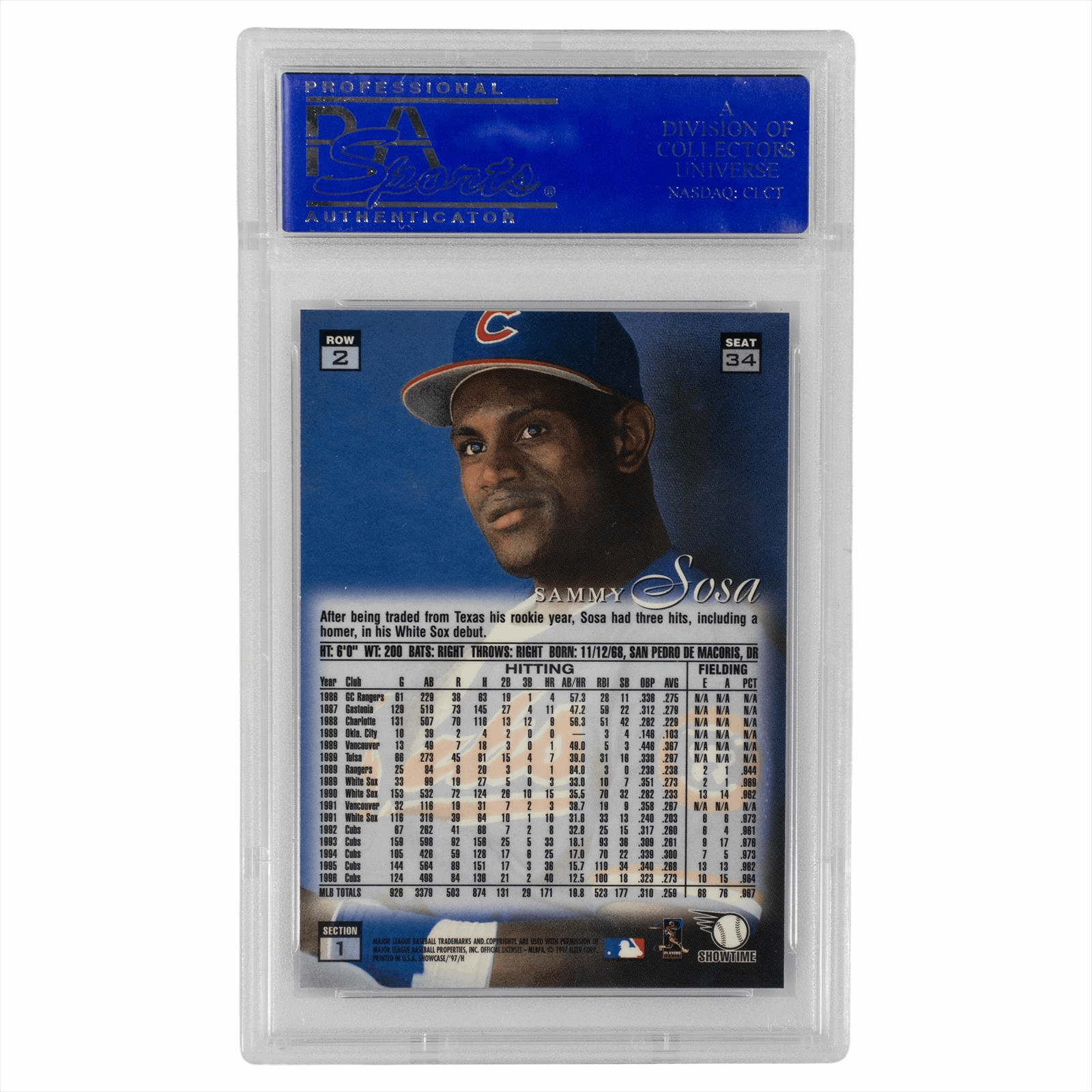 Product Details: 1997 Flair Showcase Sammy Sosa trading card, graded GEM MT 10 by PSA, features a stunning design with vibrant colors and a dynamic action shot. The card showcases Sosa in his Chicago Cubs uniform, making it a must-have for any collector. The back highlights Sosa’s career stats and details his journey, including a notable trade and achievements. The card is encased in a protective holder, ensuring its pristine condition for display or investment purposes. Perfect for baseball enthusiasts and fans of Sosa alike.