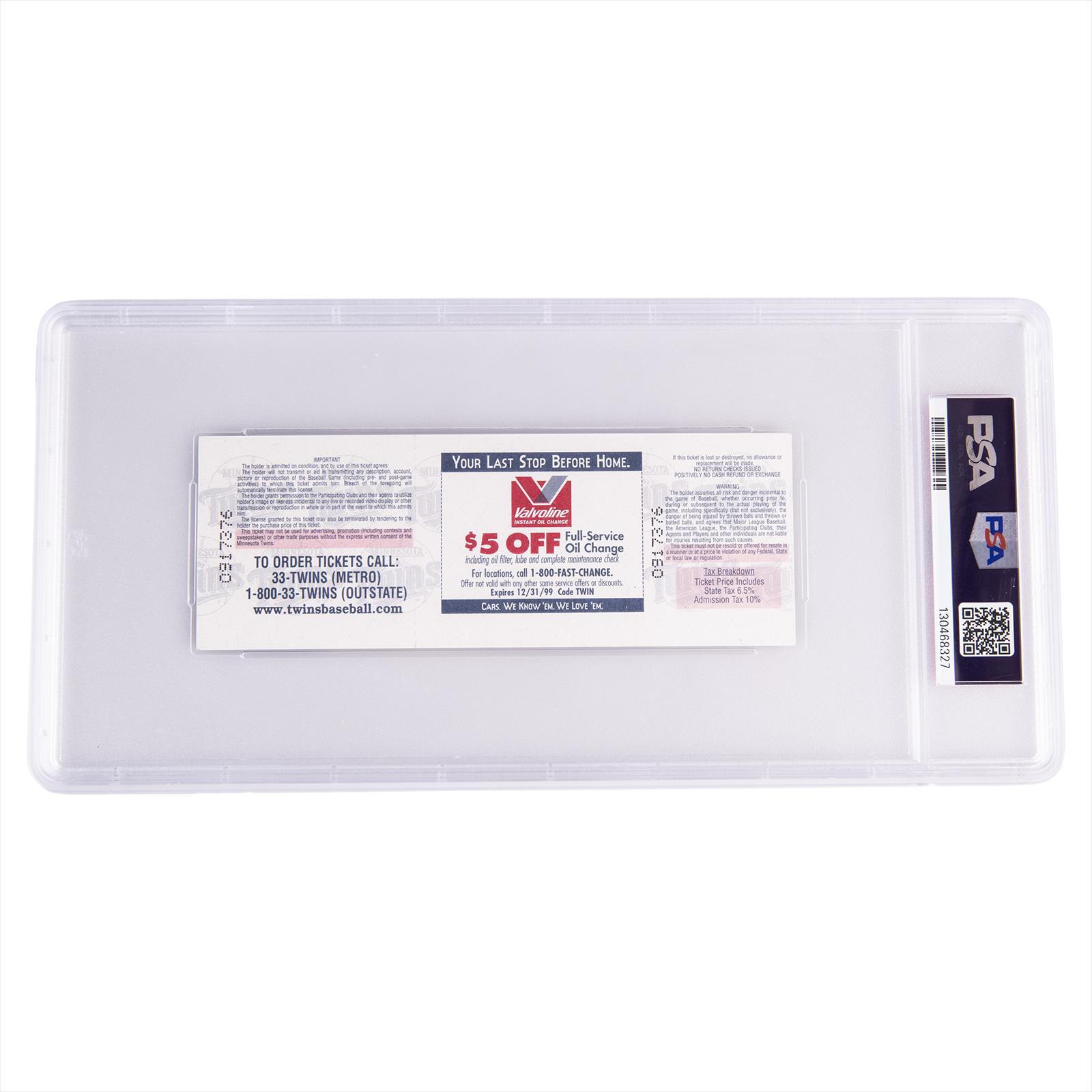 Product Details: Commemorate a memorable game with this authenticated, collectible Minnesota Twins ticket from June 19, 1999, featuring a match against the Tampa Bay Devil Rays. The ticket is clearly marked with the game details, including the date, seat information, and a notable signature, making it a unique piece of baseball history. Housed in a protective, graded holder for optimal preservation, this ticket captures the spirit of the game while showcasing the iconic team's branding. An ideal addition for sports memorabilia collectors and fans alike, this item offers a glimpse into a significant moment in Twins history. Perfect for display in any collection or as a thoughtful gift for baseball enthusiasts.