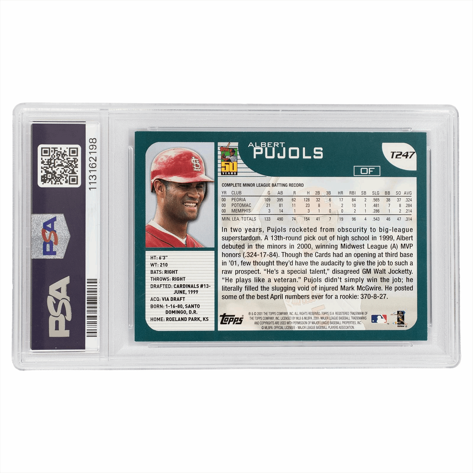 Product Details: 2001 Topps Traded Albert Pujols #T247, graded and authenticated by PSA. This rare collectible features a vibrant image of Pujols in his St. Louis Cardinals uniform, captured during his rookie season. The card showcases an authentic signature, enhancing its value and appeal to collectors. The reverse side provides a glimpse into Pujols' impressive minor league statistics and a brief narrative of his rapid ascent from an overlooked prospect to a major league superstar. The card is encapsulated in a protective case, ensuring its preservation. Ideal for enthusiasts and collectors who appreciate the legacy of one of baseball's greatest hitters. Add this remarkable piece to your collection today.