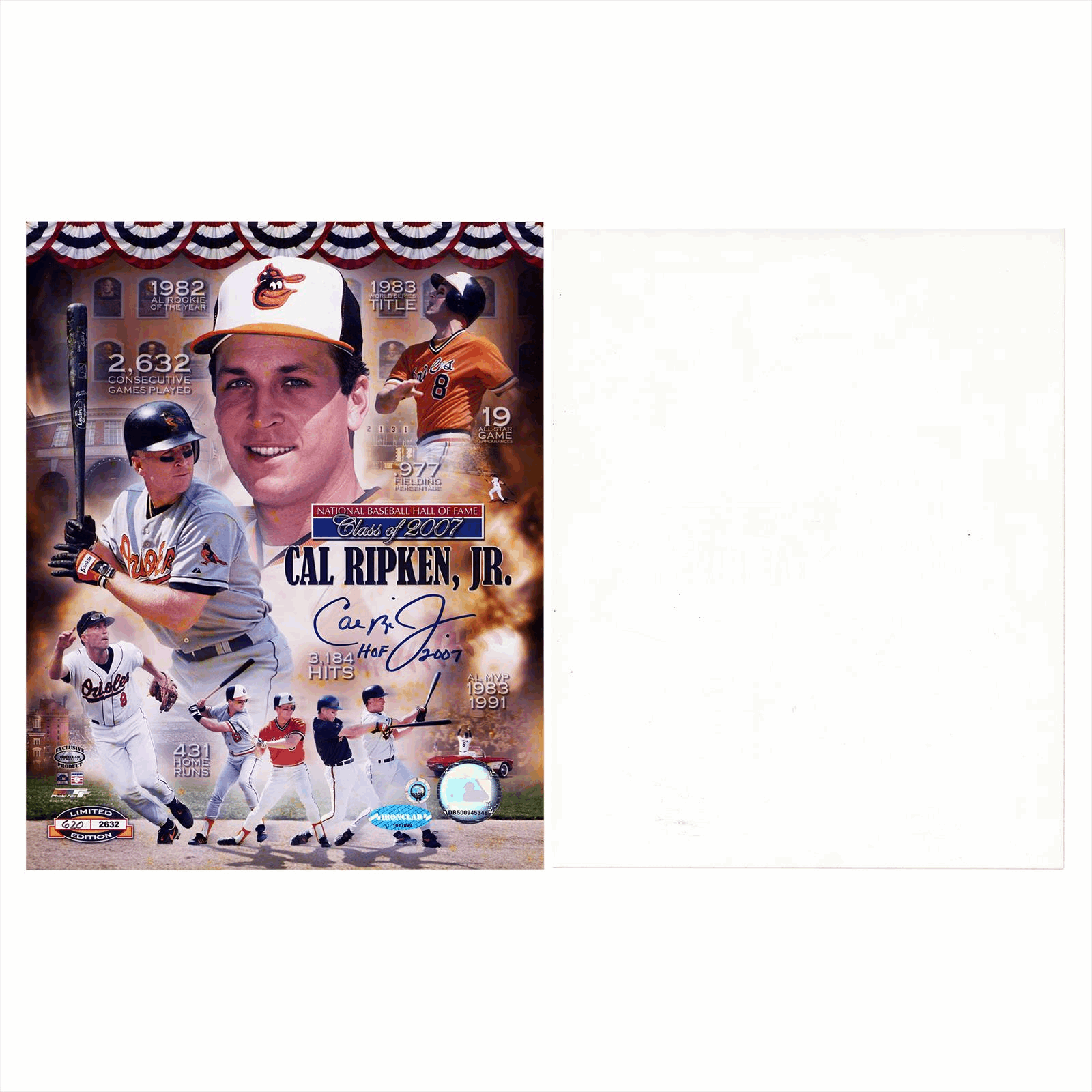 Product Details: Celebrate the legendary career of 'The Iron Man' with this hand-signed Cal Ripken Jr. collage, officially commemorating his 2007 National Baseball Hall of Fame induction. The print features a bold, blue ink signature complemented by a rare 'HOF 2007' inscription, set against a vibrant background that highlights his record-breaking 2,632 consecutive games played and 3,184 career hits. This premium collectible is authenticated by Ironclad Authentics, Ripken’s own personal memorabilia company, ensuring the autograph was obtained during a direct, supervised signing. For added security, the piece also includes an official Major League Baseball (MLB) tamper-evident hologram, making it an investment-grade addition to any Baltimore Orioles or Hall of Fame collection.