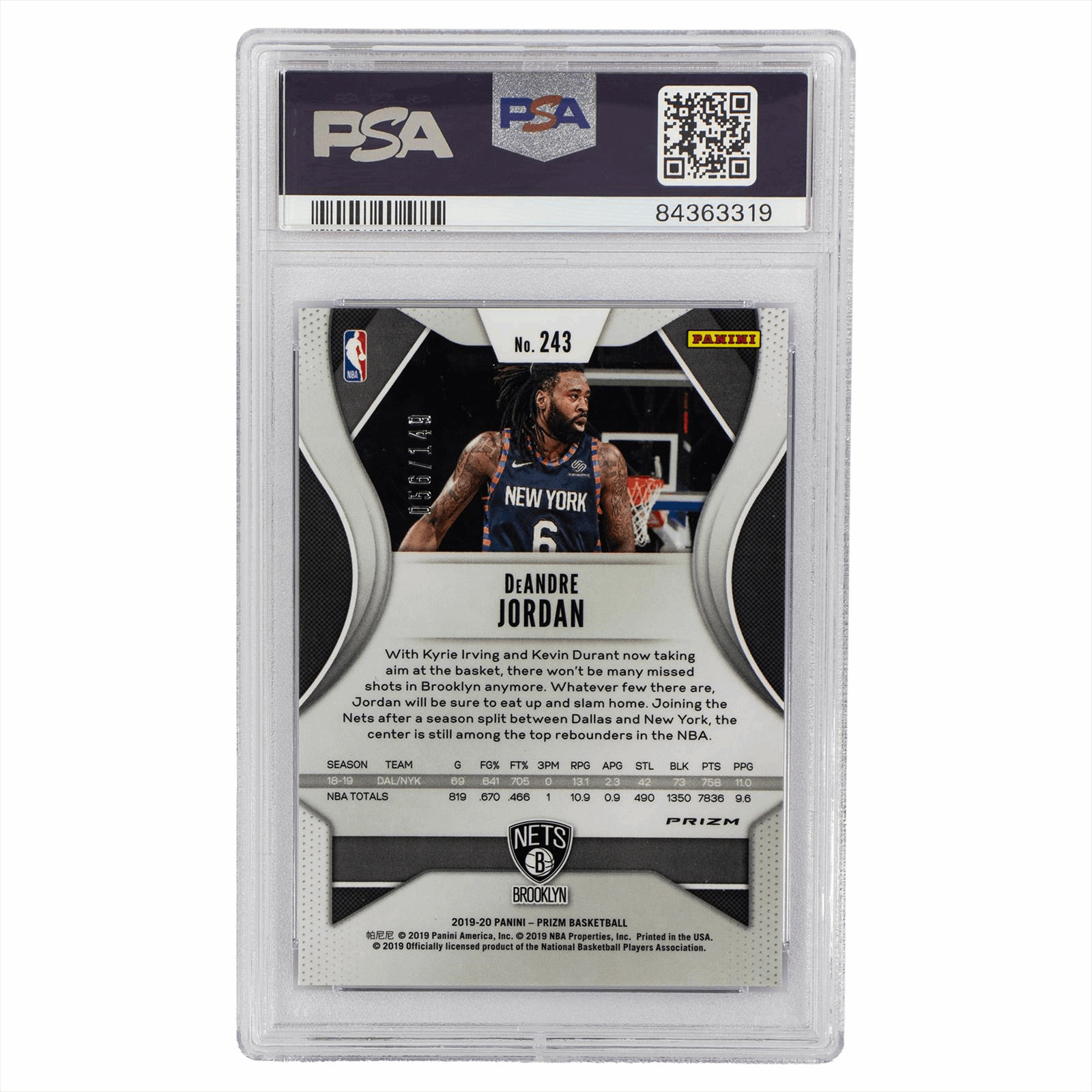 Product Details: 2019 Panini Prizm DeAndre Jordan Purple Ice #243, graded PSA 9 for mint condition. This card features vibrant colors and reflects DeAndre Jordan during his tenure with the Brooklyn Nets, showcasing his dynamic athleticism. The front highlights his strong presence on the court, while the reverse provides detailed statistics from the 2018-19 season, illustrating his impressive performance as a top rebounder. A must-have for basketball collectors and fans, this card encapsulates a key moment in Jordan’s career and serves as a standout addition to any collection.