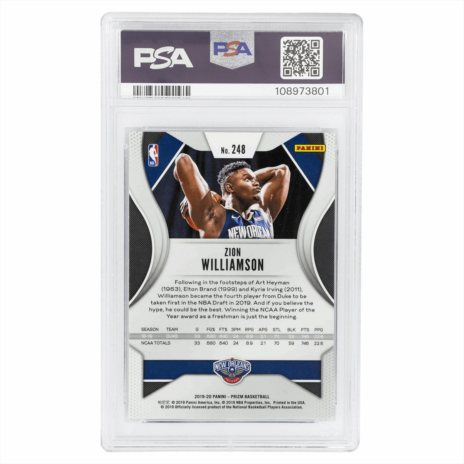This is a PSA graded card. You will receive the card pictured. You are purchasing a 2019 Panini Prizm Zion Williamson #248 PSA Authentic AUTO 10 card. This is an excellent card to add to your collection.