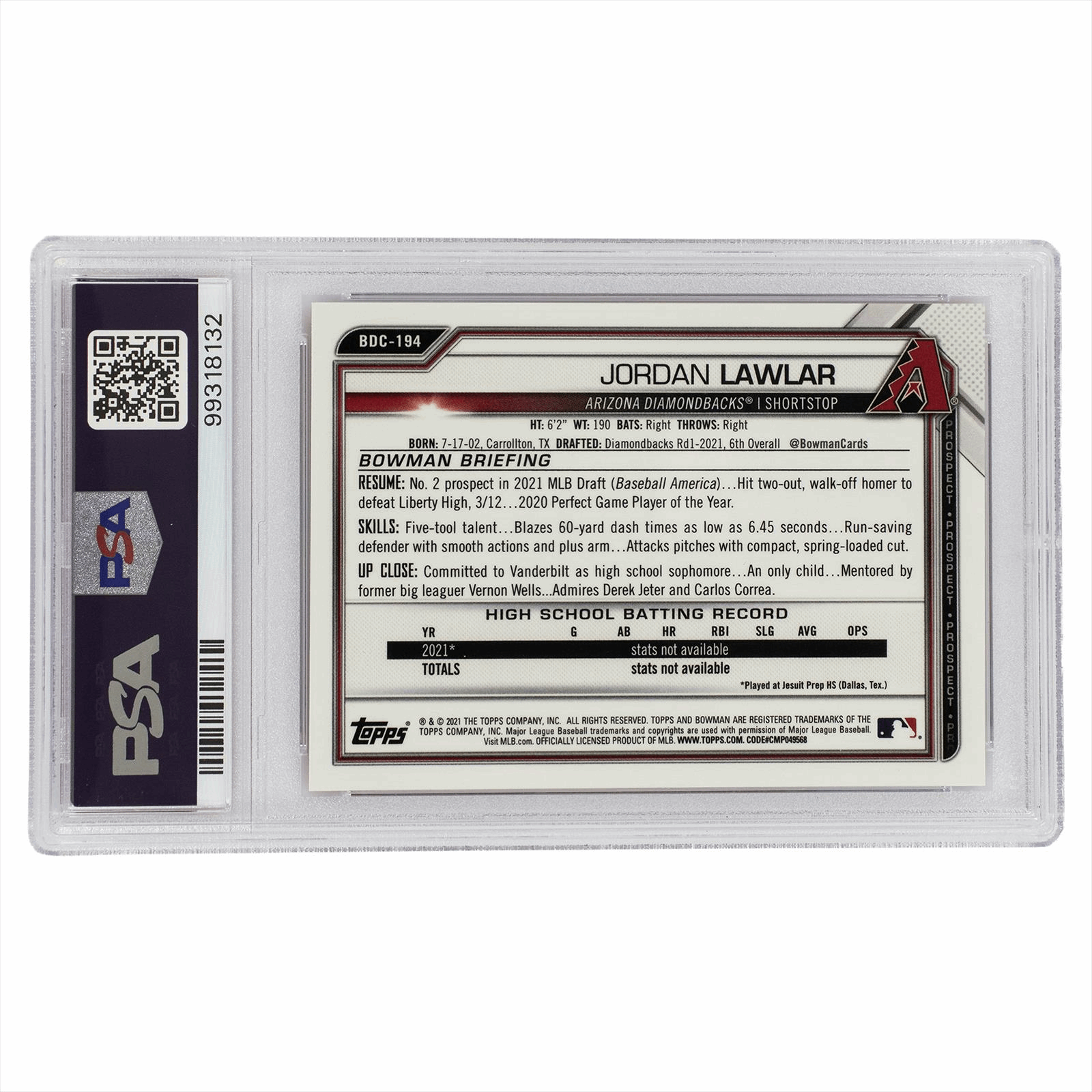 This is a PSA graded card. You will receive the card pictured. You are purchasing a 2021 Bowman Draft Jordan Lawlar Chrome-Orange Ref PSA/DNA Gem Mint 10 Auto 10 card. This is an excellent card to add to your collection.