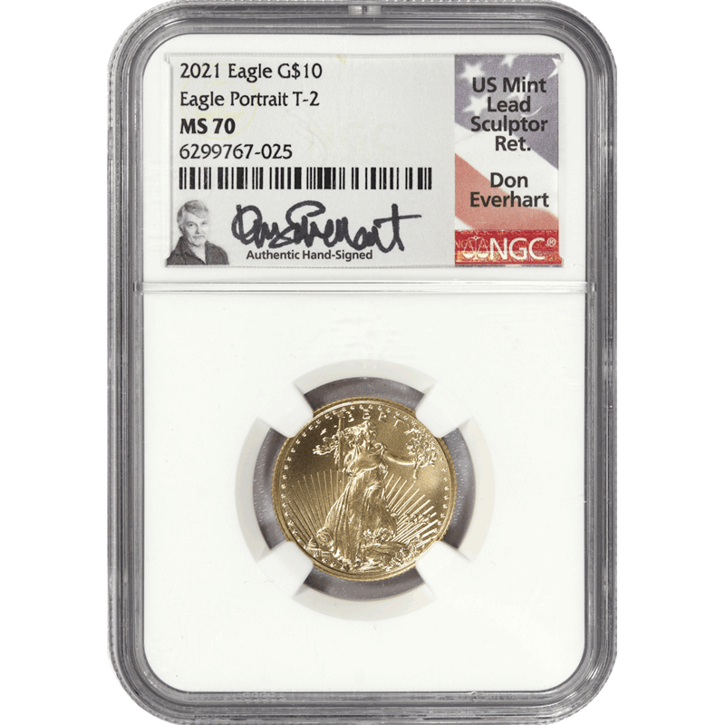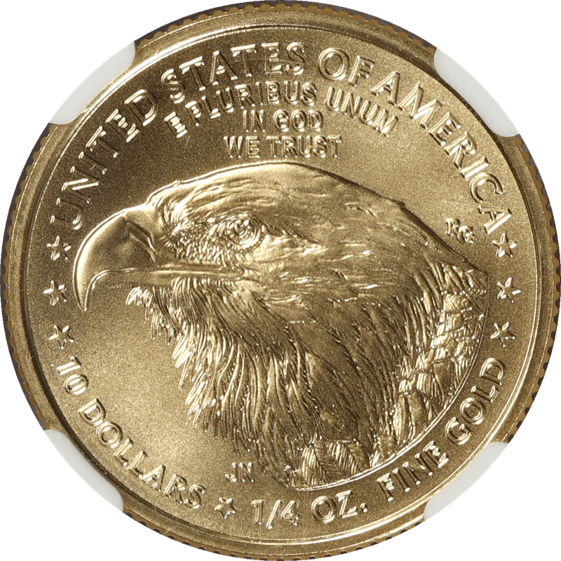 American Eagle 1/4 oz $10 Gold Coin:First released by the United States mint in 1986, the gold American Eagle was the first modern bullion coin to be authorized by the United States congress and is backed by the US Mint for its weight, content and purity. The obverse of the coin, originally designed by Augustus Saint-Gaudens for the country's $20 gold piece minted from 1907 to 1933, carries the image of a full length figure of Lady Liberty holding a torch in her right hand and an olive branch in her left. The reverse side of the coin bears the image of a male bald eagle carrying an olive branch, flying towards his mate in a nest with their hatchlings. The one half ounce gold American Eagle by the United States Mint has a face value of $.