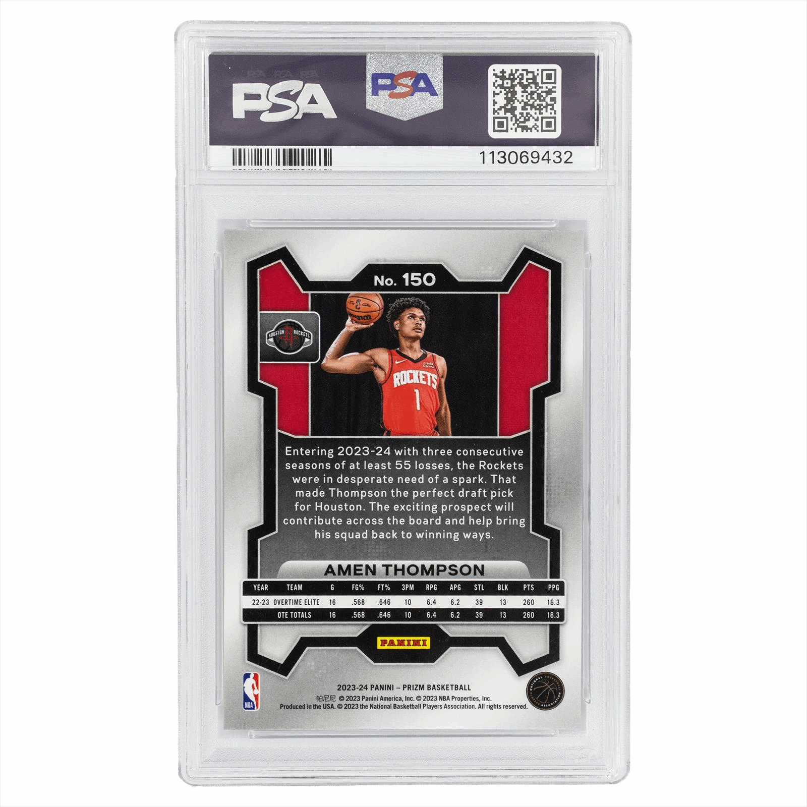Product Details: Own a high-stakes piece of the Houston Rockets' future with this 2023-24 Panini Prizm Amen Thompson Rookie Card. This #150 base rookie features a crisp, on-card autograph that has earned a perfect AUTO 10 grade for its flawless signature quality. The card itself is preserved in a PSA 8 NM-MT slab, striking an ideal balance between premium collectibility and market value for modern basketball investors. As a cornerstone of the 2023 draft class, this authenticated Prizm rookie remains one of the most sought-after cards for those tracking the elite athleticism of the Thompson twins. Card Features: