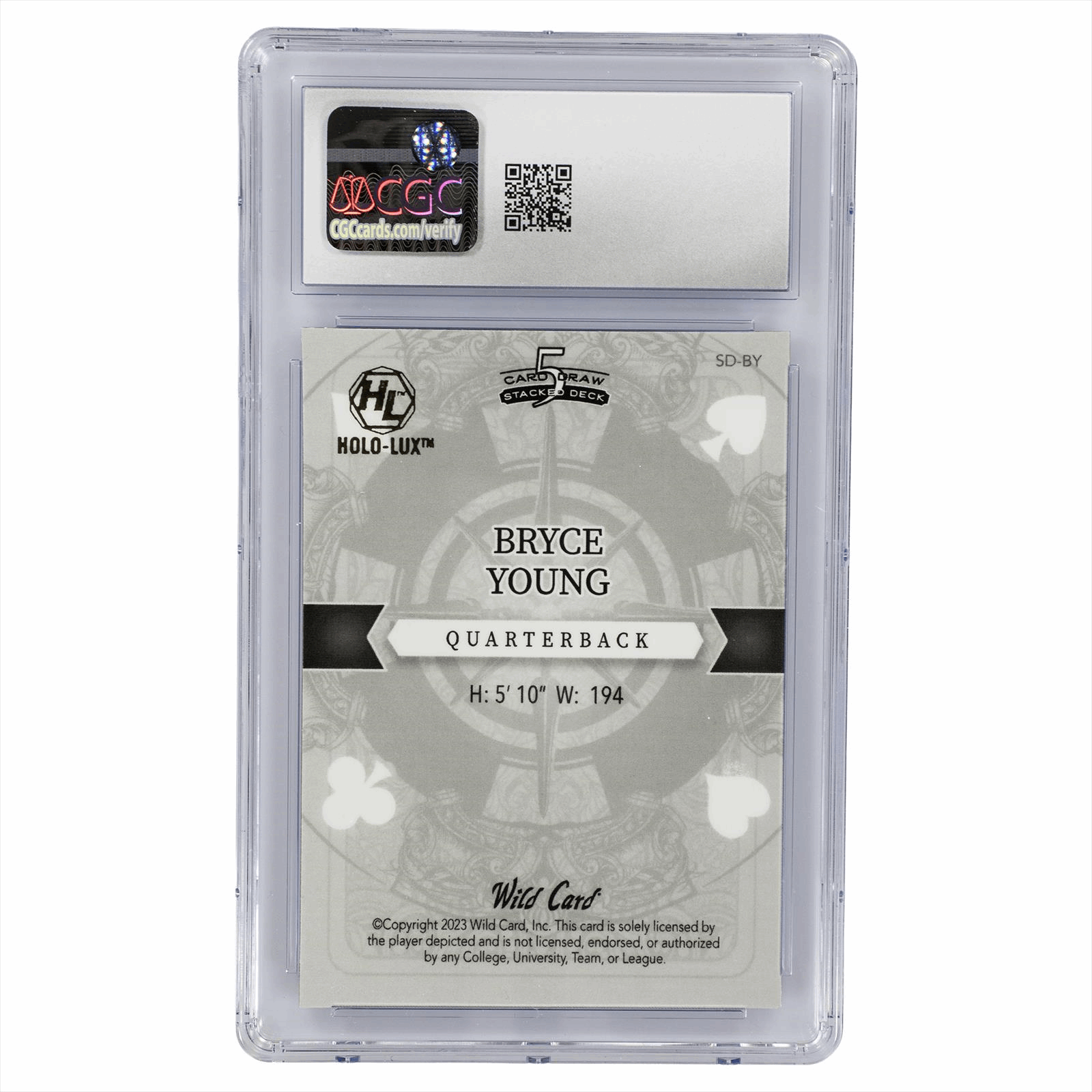 This is a CGC graded card. You will receive the card pictured. You are purchasing a 2023 Wild Card 5 Card Draw Stacked Ace Diamonds Bryce Young #SD-BY CGC Mint+ 9.5 card. This is an excellent card to add to your collection.