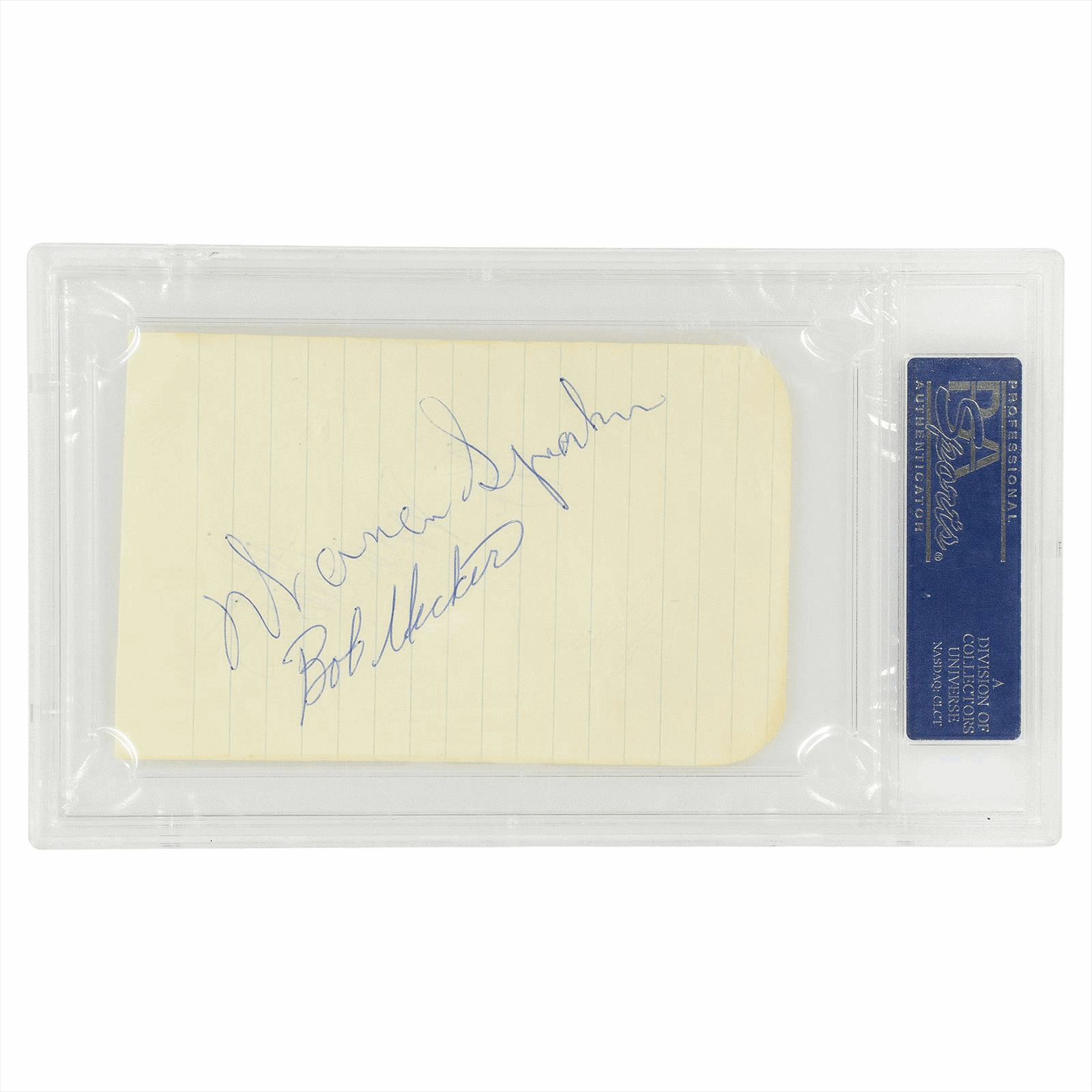 Product Details: This rare multi-signature cut brings together a legendary ensemble of baseball history, featuring the authenticated autographs of Bob Uecker, Eddie Mathews, Warren Spahn, and Bob Lemon. Each signature represents a unique pillar of the game, from the power-hitting prowess of Mathews and the legendary southpaw dominance of Spahn to the Hall of Fame pitching of Lemon and the beloved 'Mr. Baseball' himself, Bob Uecker. Encapsulated and certified by PSA/DNA, this piece ensures absolute peace of mind for collectors regarding its authenticity and long-term preservation. Whether you are a fan of the Milwaukee Braves or a dedicated seeker of Hall of Fame greatness, this quadruple-signed treasure stands as a centerpiece of mid-century baseball nostalgia.