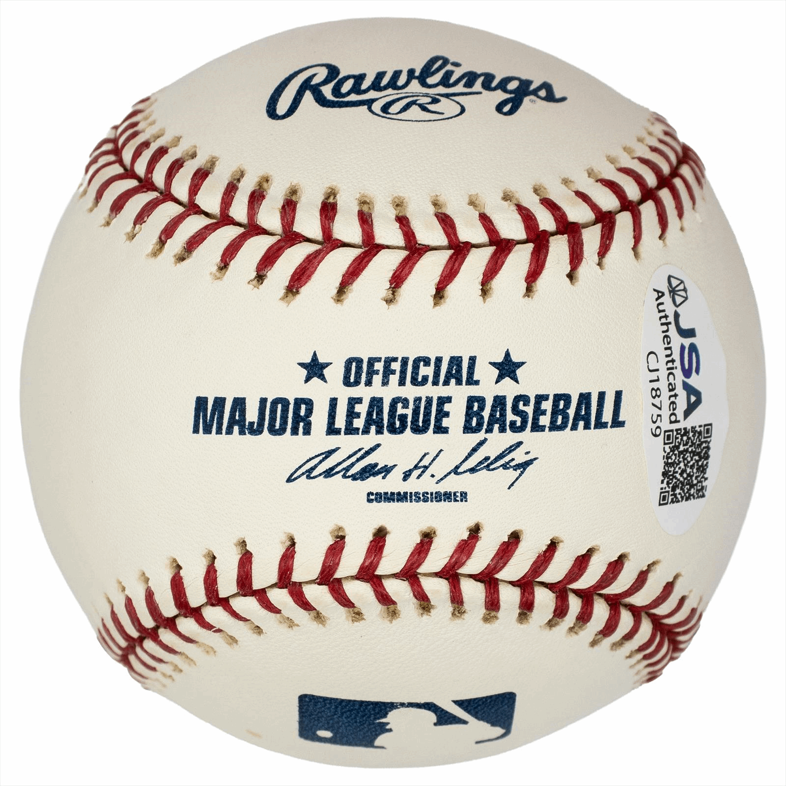 Product Details: Official Major League Baseball, featuring authentic craftsmanship by Rawlings. This baseball is distinguished by its signature, enhancing its appeal for collectors. The classic white leather exterior is complemented by contrasting red stitching, ensuring durability and visual appeal. An official JSA authentication sticker verifies its authenticity, making it a perfect addition to any sports memorabilia collection. Ideal for display or as a unique gift for baseball enthusiasts. Ball Features: