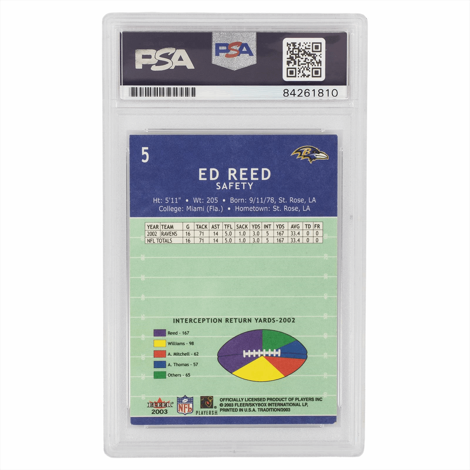 Product Details: Ed Reed trading card from the Fleer Tradition series, featuring a striking design that highlights his accomplishments as a safety for the Baltimore Ravens. The front showcases a vibrant image of Reed in action, complete with his autograph and team colors. PSA/DNA certified for authenticity, this collectible is a must-have for any serious football fan or card collector. On the reverse, detailed statistics provide insights into Reed's impressive career, including his height (5'11'), weight (205 lbs), and college background. The stats reflect his standout performance during the 2002 season, emphasizing his key role in the Ravens' defense. This graded card is presented in a protective case, ensuring its quality and preserving its value for years to come. Add this iconic piece to your collection and celebrate the legacy of one of the NFL's finest safeties.