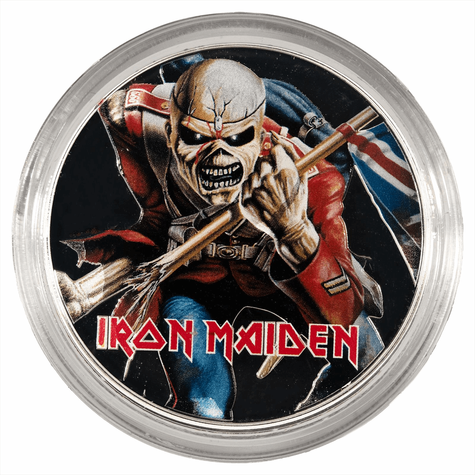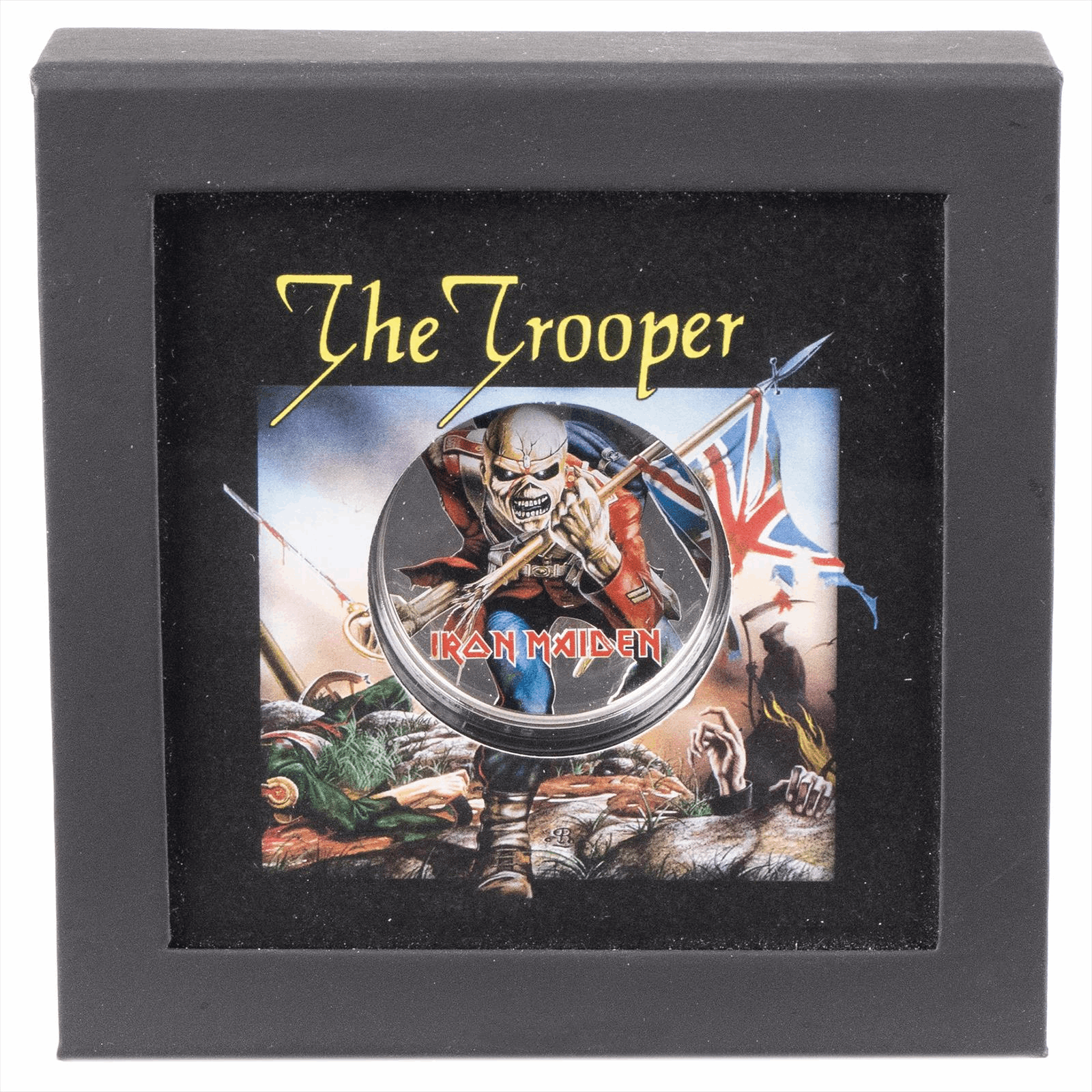 Product Details: Celebrating the legendary band Iron Maiden, this collectible coin features a striking design inspired by the iconic song 'The Trooper.' Housed in an elegant display box, the coin showcases stunning artwork of the band's mascot, Eddie, in a soldier’s uniform wielding a flag, capturing the spirit of the song's historical theme. Specifications: - Material: 1 oz .999 fine silver - Diameter: 40 mm - Face Value: 5 Dollars (Cook Islands) - Year: 2023 - Finish: Brilliant Uncirculated - Limited mintage for collectors The reverse side of the coin proudly features the likeness of Queen Elizabeth II, complementing its collectible appeal. This meticulously crafted piece is perfect for both dedicated fans of Iron Maiden and numismatic enthusiasts alike. Each coin is encapsulated for protection, ensuring its lasting beauty and value as a collectible relic of rock history.
