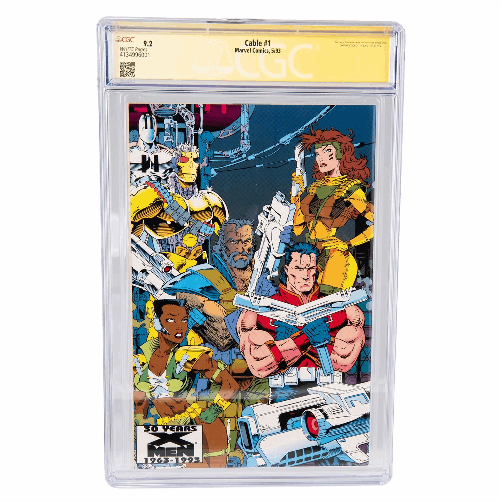 Product Details: Marvel's *Cable #1*, published in May 1993, features stunning artwork and is a must-have for collectors. Graded 9.2 by CGC, this comic presents the iconic character Cable in a dynamic, action-packed portrayal. The front cover showcases vibrant colors and bold lettering, highlighting key story elements. Signature from John Byrne amplifies its collectible value, enhancing its appeal among fans. The back cover features additional characters from the X-Men universe, emphasizing the crossover popularity of the series. With white pages and a clear protective case, this comic is in excellent condition, ready to be displayed or cherished. A true gem for both comic enthusiasts and serious collectors alike.