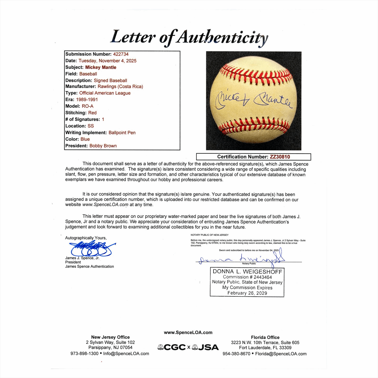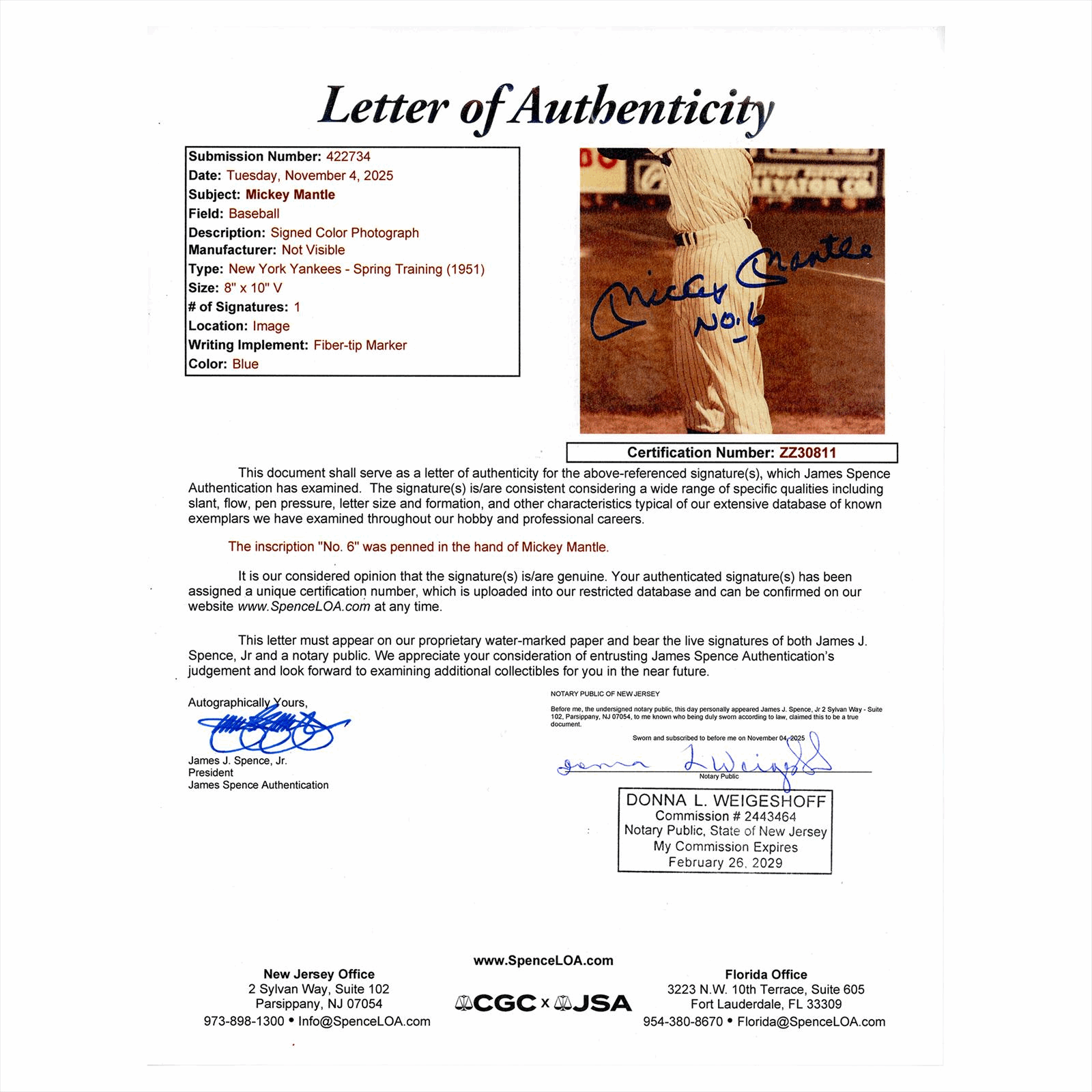 This is a JSA Certified signed photo and. You will receive the card pictured. You are purchasing a Mickey Mantle Signed No.6 ( Rookie #) Inscribed 8x10 with Signed Ball Framed JSA LoA card. This is an excellent card to add to your collection.
