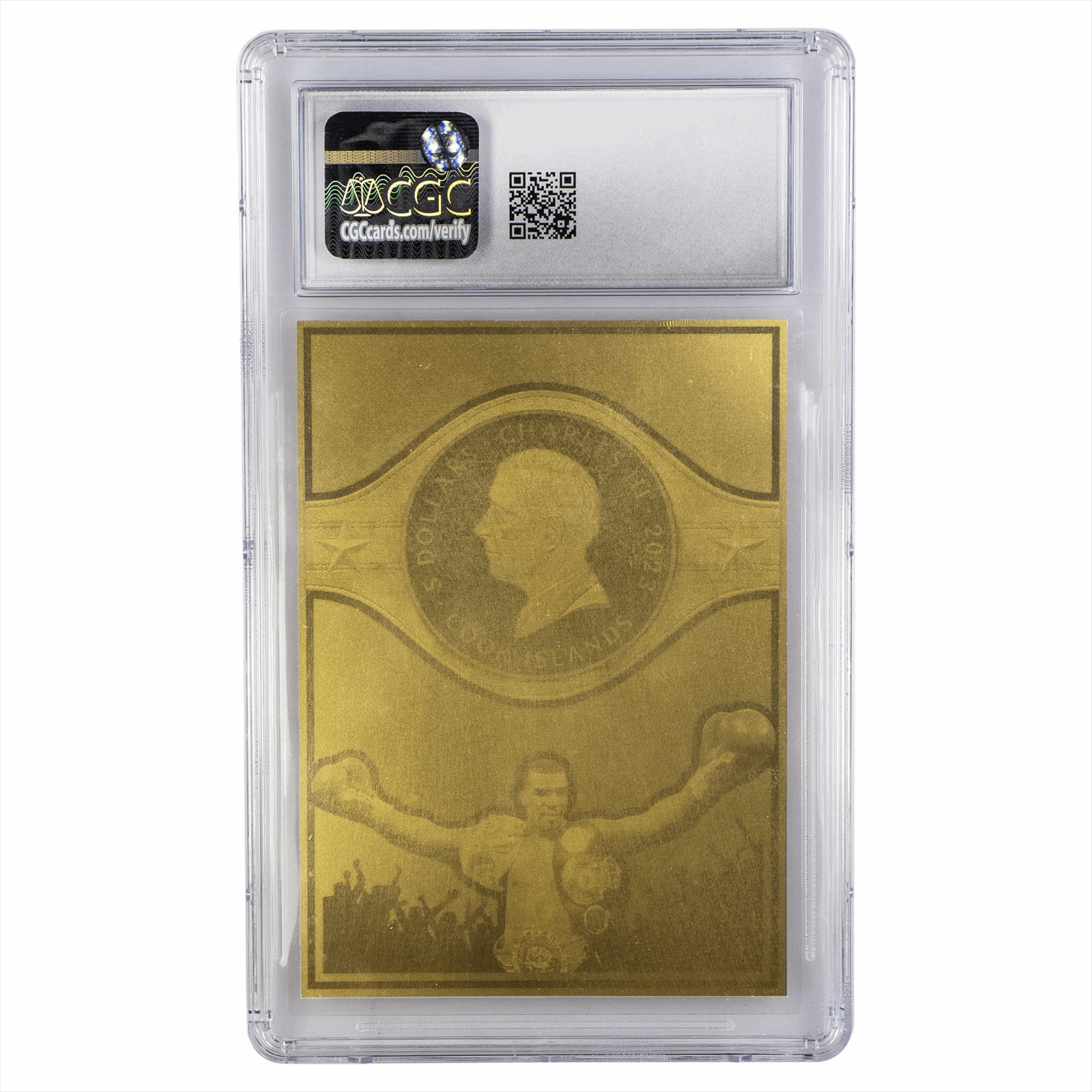 Each is emblazoned with the iconic Tyson photo featured on the cover of Ring Magazine during the height of his career. This crisp imagery is surrounded by a mult-textured gold etched in reflective patterns creating a glowing background against the representation of the young champ. The reverse offers the effigy of King Charles III, denomination and Cook Island recognition imposed across a championship belt with a triumphant Tyson beneath with outstretched arms and adoring fans.