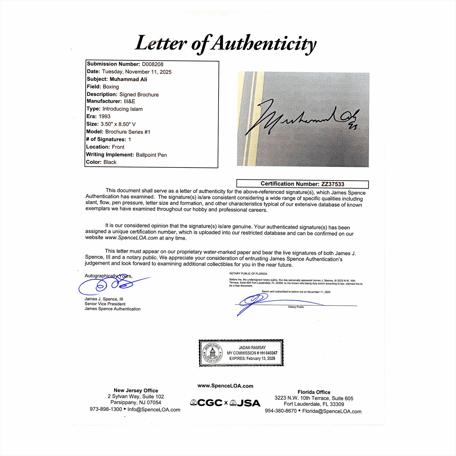 This is a CGC/JSA certified signed brochure. You will receive the brochure pictured. You are purchasing a Muhammad Ali Signed III&E Pamphlet Intro to Islam JSA Certified. This is an excellent addition to your collection.