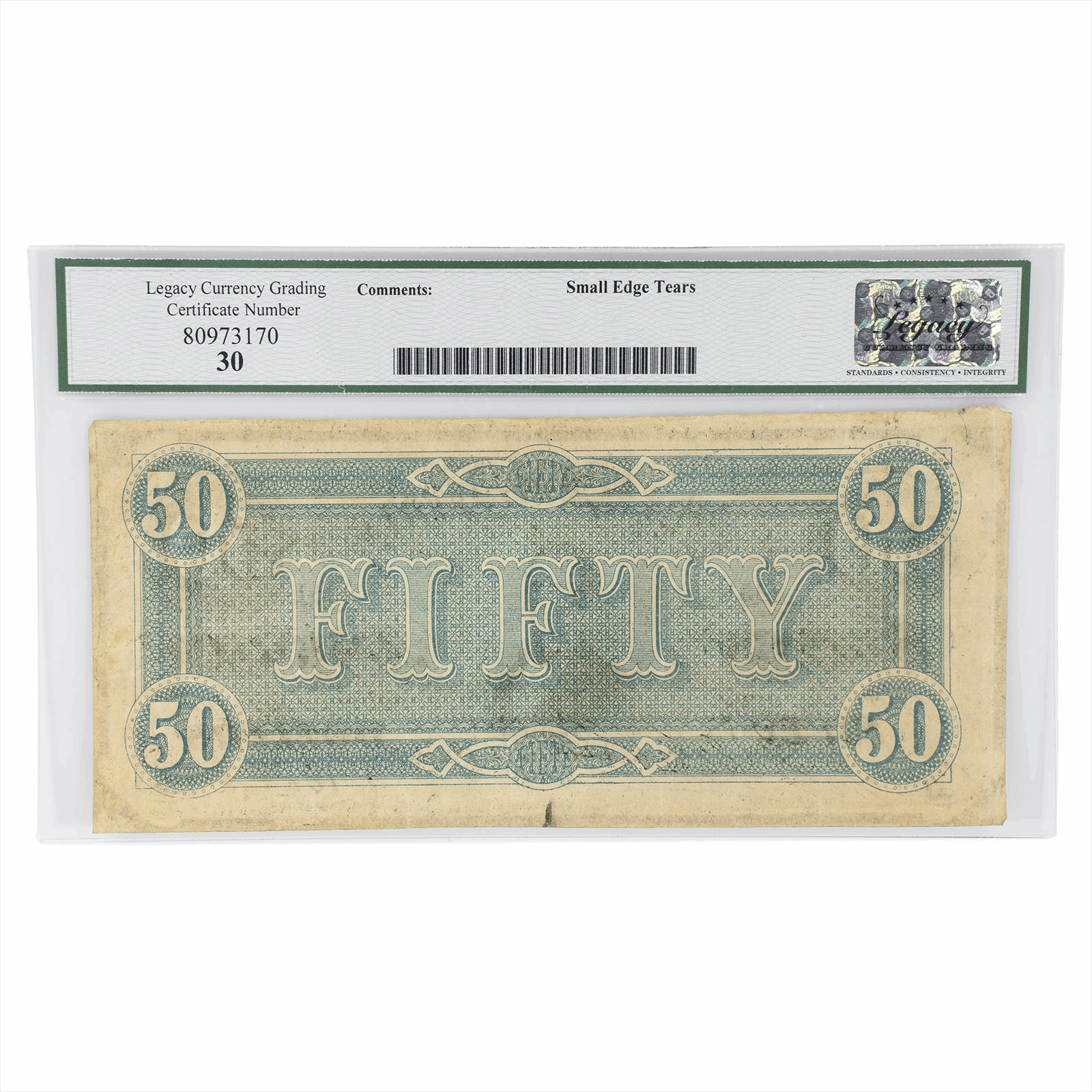 Product Details: T-66 1864 $50 Confederate States of America currency, graded Very Fine (30). Features an iconic design with intricate details and historical significance. Front displays a portrait of a dignified figure, flanked by ornate text and currency symbols. The back showcases a vivid green design with the word 'FIFTY' prominently featured, adding to its collectible appeal. Encased for protection, this piece exhibits small edge tears, indicative of its authenticity and journey through history. A must-have for collectors and history enthusiasts alike.